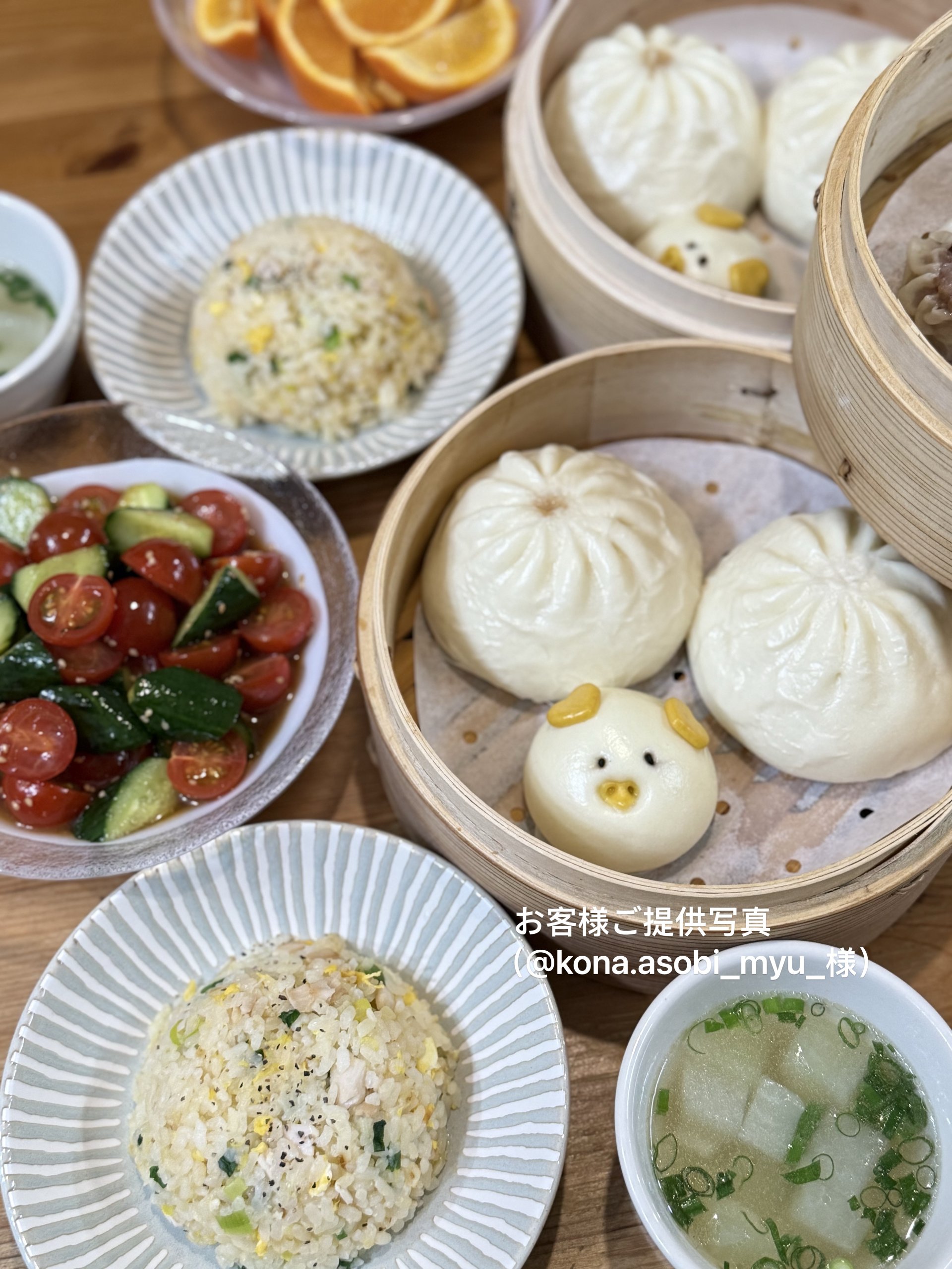 ■ 基本の食べ方(蒸し) 1. 蒸し器にお湯を入れ、しっかりと沸騰させます。 2. 凍ったままの肉まんを蒸し器に並べます。 3. 約15〜17分間蒸して、ふっくらとした状態に仕上げます。  ※ 蒸し時間は個体によって状況が異なる場合がありますので、  様子を見ながら調整してください。